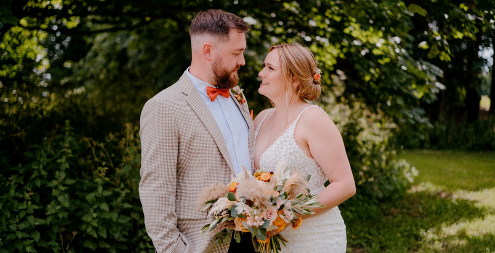 Emma and Harry had chosen to decorate the barn in vibrant sunny shades of gold and orange which highlighted the brickwork of the barn beautifully. The couple exchanged their vows in the Main Barn with a gorgeous backdrop of fairy lights and foliage.