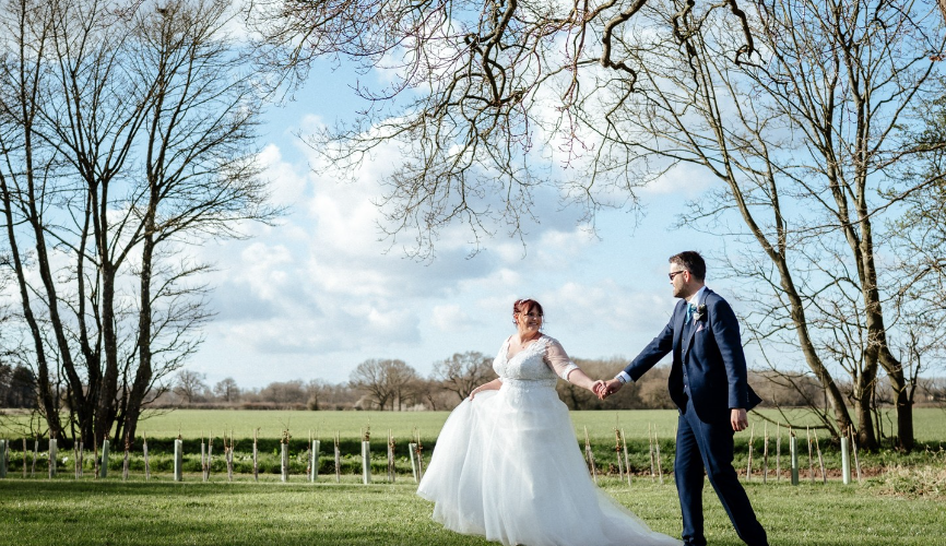 With the sun shining and bright blue skies, our newlyweds made the most of the outside space; posing for photographs with Cooper the dog on the areas of hardstanding, framed by the mature landscaping in the grounds.